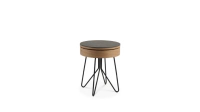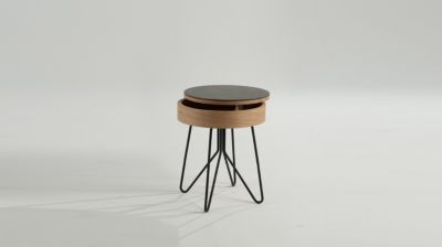 Le plateau pivotant en céramique permet d'accéder à l'intérieur du caisson de rangement en bois ...