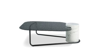 Bloc en marbre, plateau en verre gaufré fumé et armature en métal noir.