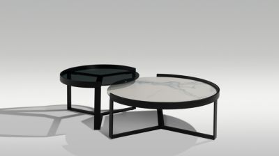 Graphiques et aériennes les tables basse EGO , allient une structure laquée noire avec des plateaux en verre trempé fumé ou en céramique arabescato qui peuvent s’encastrer pour former un élégant duo. Le grand modèle fait 90 cm de diamètre et le moyen modèle 70 cm. ...