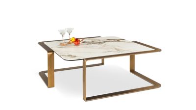La table Oregon possède une élégante sobriété, sa structure déploie un ruban de métal qui encadre délicatement le plateau carré aux lignes arrondies en céramique au décor de marbre. ...