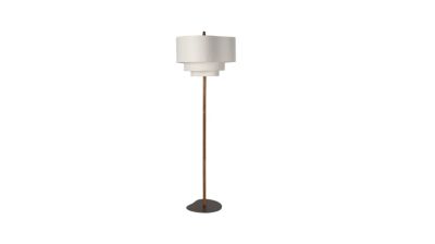 Lampadaire avec base en Métal brossé et Bois teinté, équipée d'un cordon textile avec toupie en Bois. Triple abat-jour forme organique en Coton et Lin. E27 15W ...