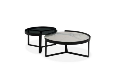 Graphiques et aériennes les tables basse EGO , allient une structure laquée noire avec des plateaux en verre trempé fumé ou en céramique arabescato qui peuvent s’encastrer pour former un élégant duo. Le grand modèle fait 90 cm de diamètre et le moyen modèle 70 cm. ...